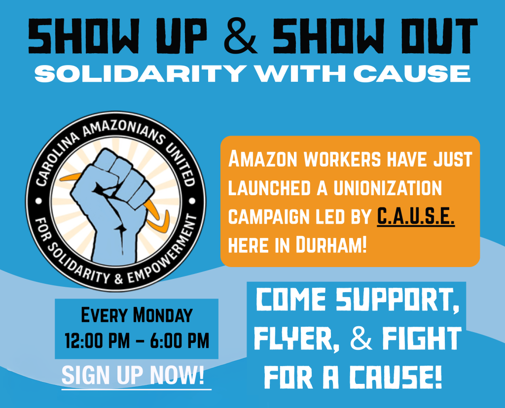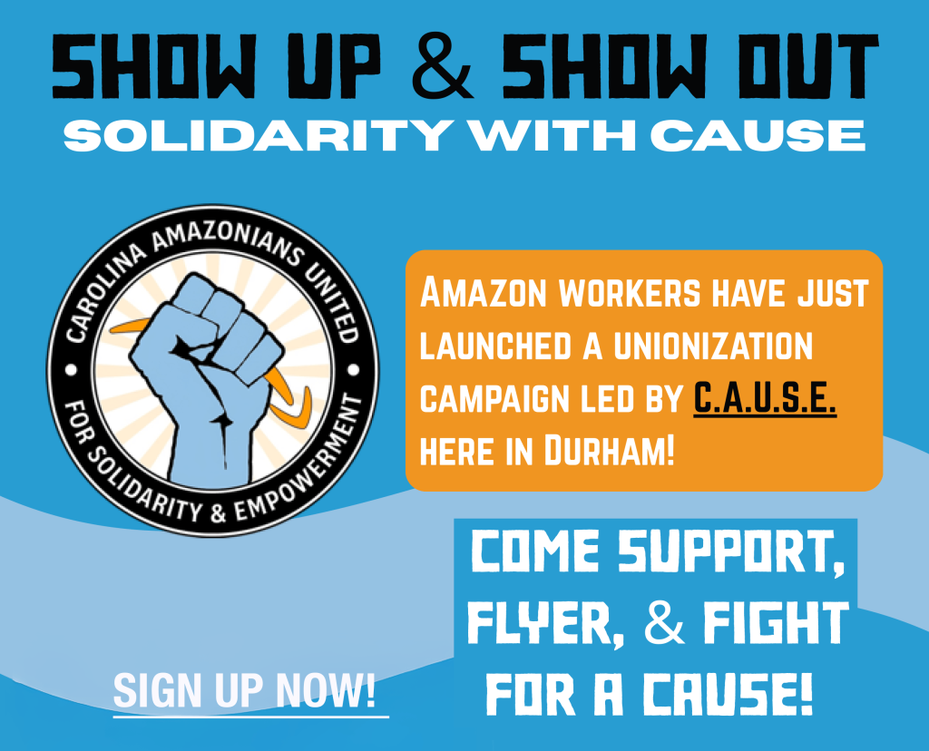 C.A.U.S.E. is a worker-led movement defending workers’ rights & organizing to battle the corruption and exploitation by Amazon. We seek to form a union to represent all Amazon’s workers, starting here in North Carolina.